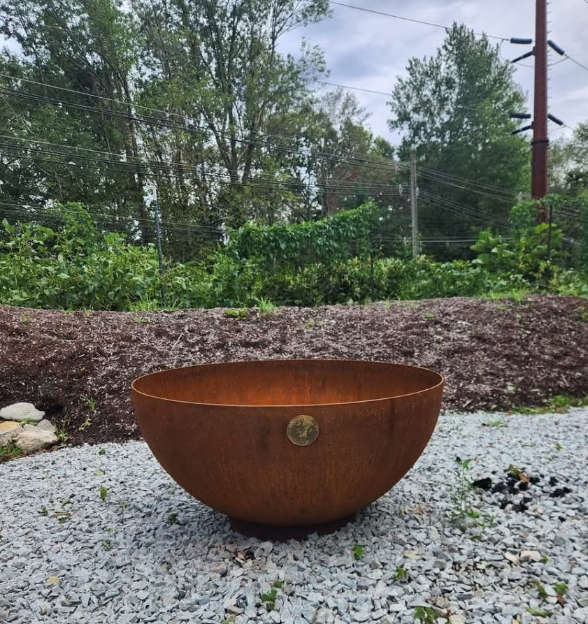 40" diameter hemispherical Burn Bowl with collar base. The high sides of the bowl radiate heat and help to shield the fire from the wind without obstructing the view of the flames. This has been a customer favorite.
